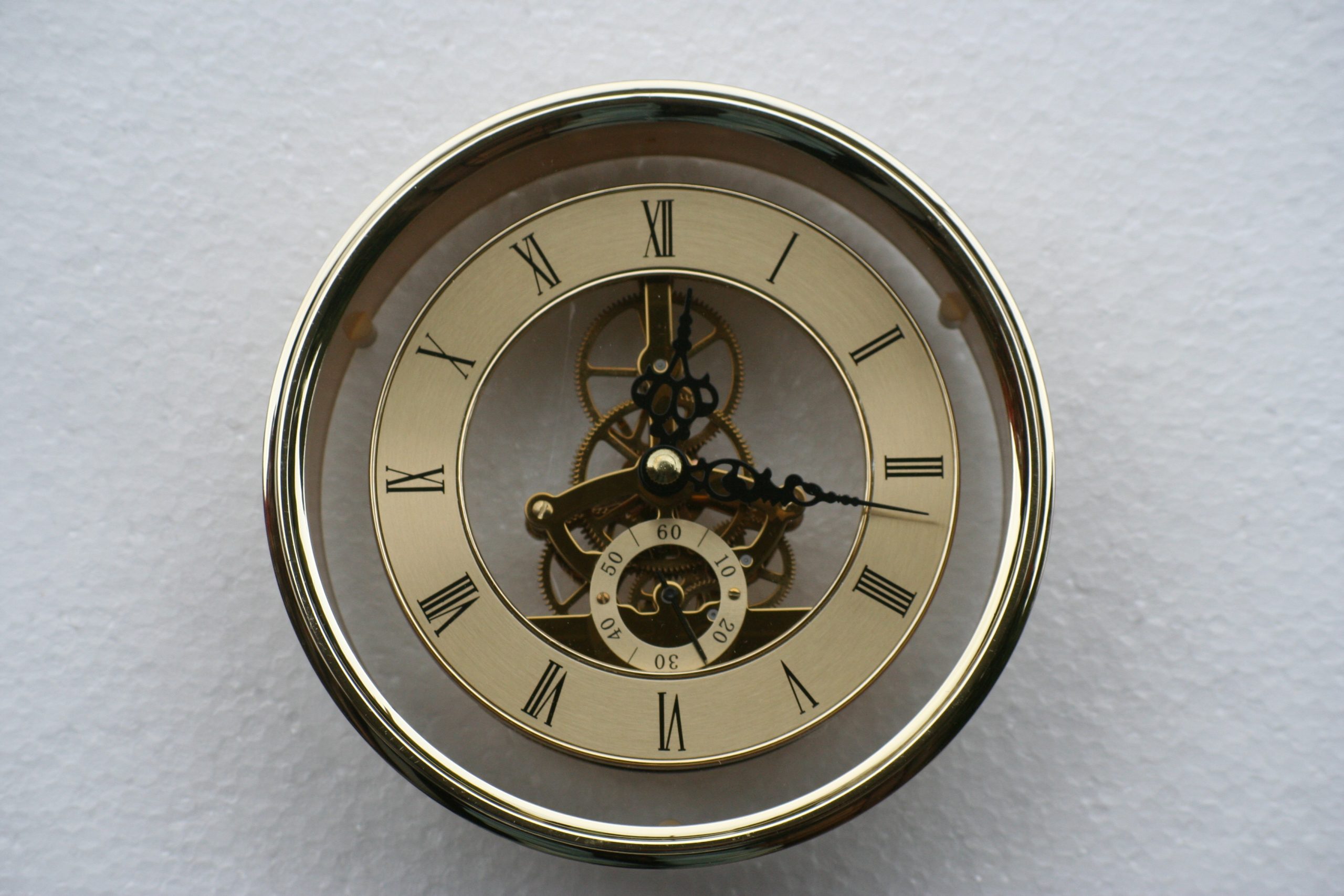 Skeleton Clock 149mm diameter fits 145mm diameter hole 36mm deep or 42mm when wall mounted. Held in place with a rubber ring. Brass finish with 111mm Roman chapter ring. 30mm diameter separate minute indicator.